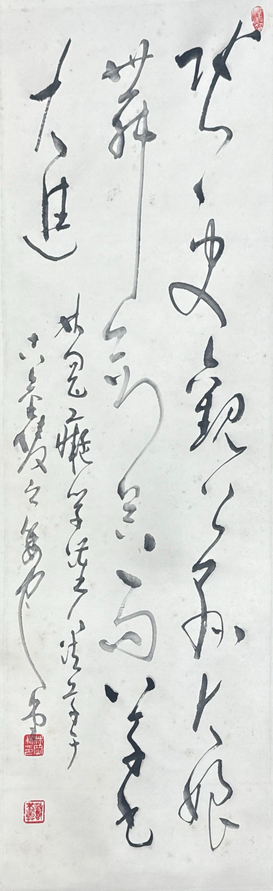 起筆如劍器出鞘,鋒芒里裹著公孫大娘舞袖的輕揚(yáng);行筆似劍花翻旋,墨色濃淡間,藏著張旭當(dāng)年觀舞時(shí)“自此草書大進(jìn)”的頓悟;收筆若舞罷收勢,余韻里還留著盛唐的颯爽氣。林崗先生寫這卷時(shí),是把“張旭觀舞悟書”的千年典故,和自己幾十年的功底擰在了一處:六歲習(xí)顏楷立骨,師事林散之、高二適得法,又經(jīng)謝居三、李味青指點(diǎn)得韻,連三千漢字的甲骨文源流都研透了,才讓每個(gè)字既有“取法乎上”的古意,又藏著鮮活的故事。