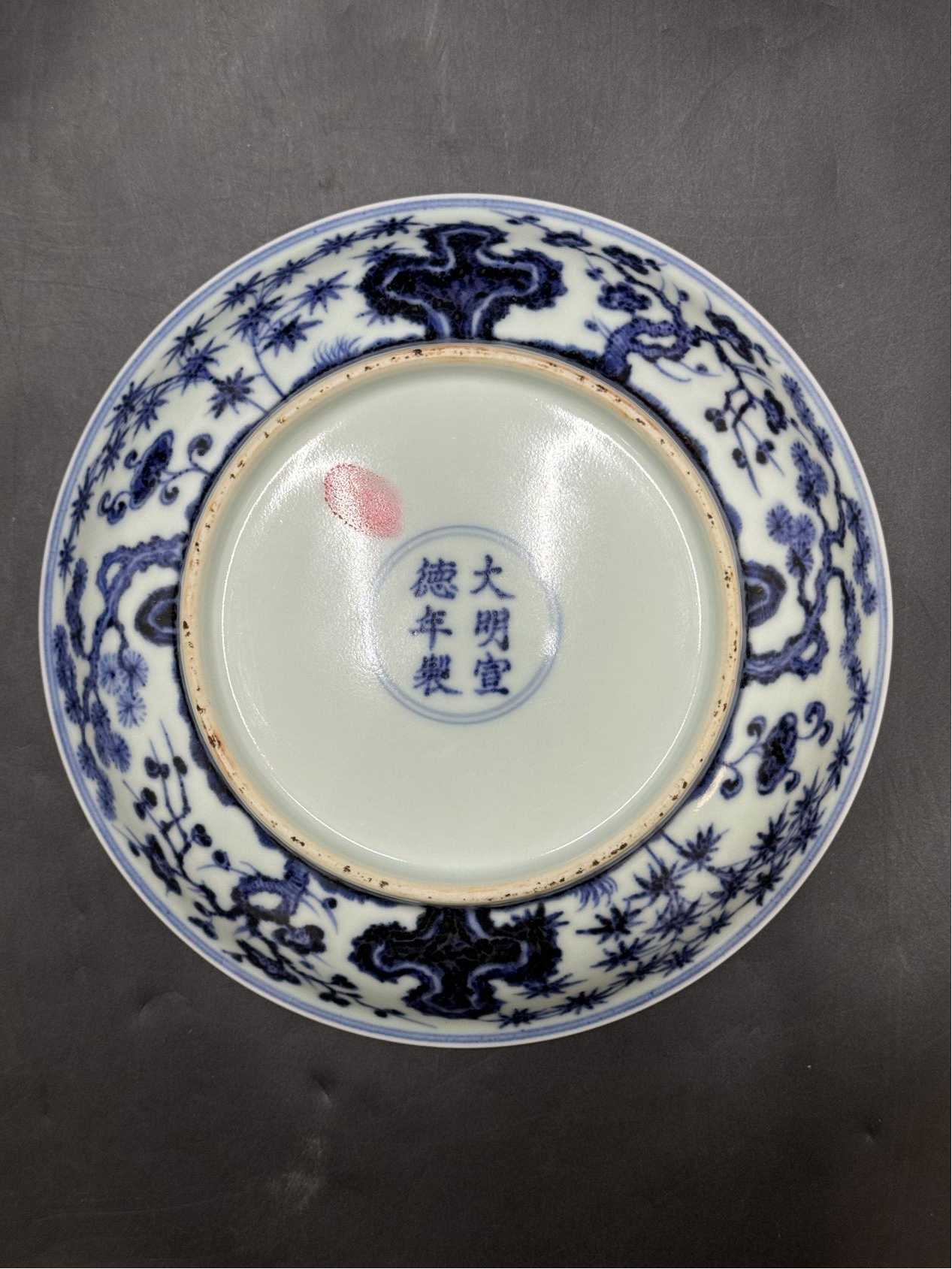 底足細節(jié)是官窯身份的核心佐證:底心以青花雙圈署“大明宣德年制”六字雙行楷書款,字體結(jié)構(gòu)端莊,筆力遒勁,符合宣德官窯款識“字口清晰、排列規(guī)整”的特征;圈足修胎圓潤,露胎處可見“糯米胎”質(zhì)地——胎土經(jīng)多次淘洗,細膩致密,撫之如嬰兒肌膚,是宣德官窯制胎工藝的標志性表現(xiàn)。從傳世數(shù)據(jù)來看,宣德朝蘇麻離青青花盤存世量稀少,據(jù)《明清瓷器鑒定》記載,兩岸故宮及主要博物館館藏總量不足二十件,而流通于拍賣市場的全品器物更為罕見,此件器物器型完整、釉色如新,無沖線、無剝釉,屬同類器物中的佳品。