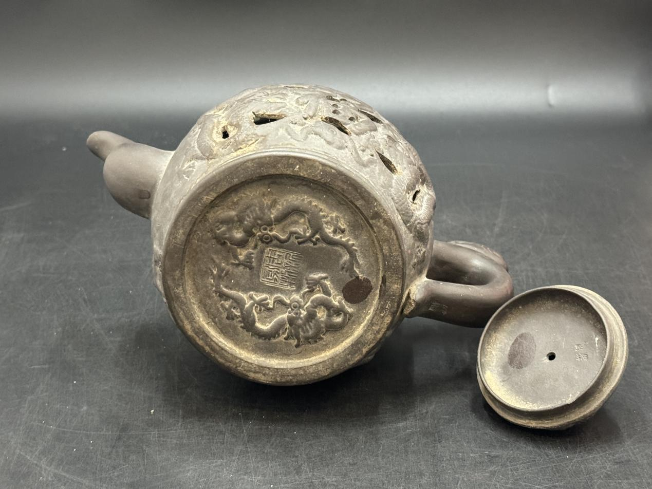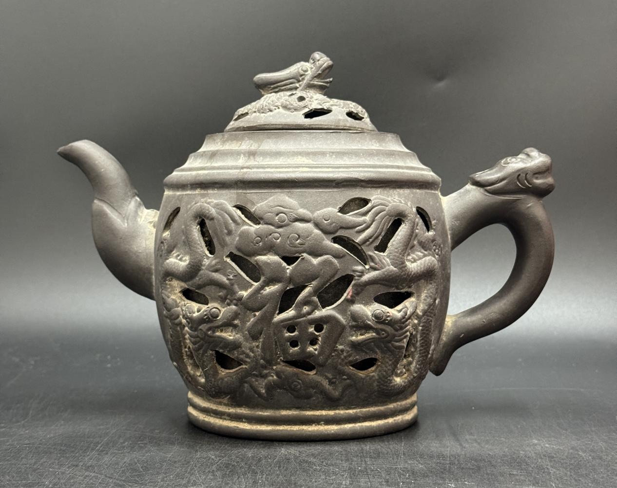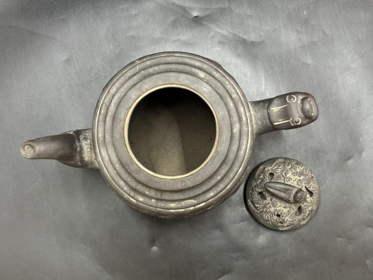 壺身以“九龍聚福”為魂,鏤空雕工將九條祥龍的身姿刻畫得靈動鮮活,龍鱗層疊細膩,龍爪遒勁有力,云霧繚繞間,“福”字隱于龍紋之中,既顯中式“藏福”的巧思,又讓器型層次飽滿、氣韻生動。壺鈕取龍首為形,壺把以龍身蜷曲成勢,壺嘴似龍首探水,全器從細節(jié)到整體,皆貫穿著“龍”這一華夏圖騰的威嚴與祥瑞,恰合“九龍聚鼎,福澤綿長”的吉意。