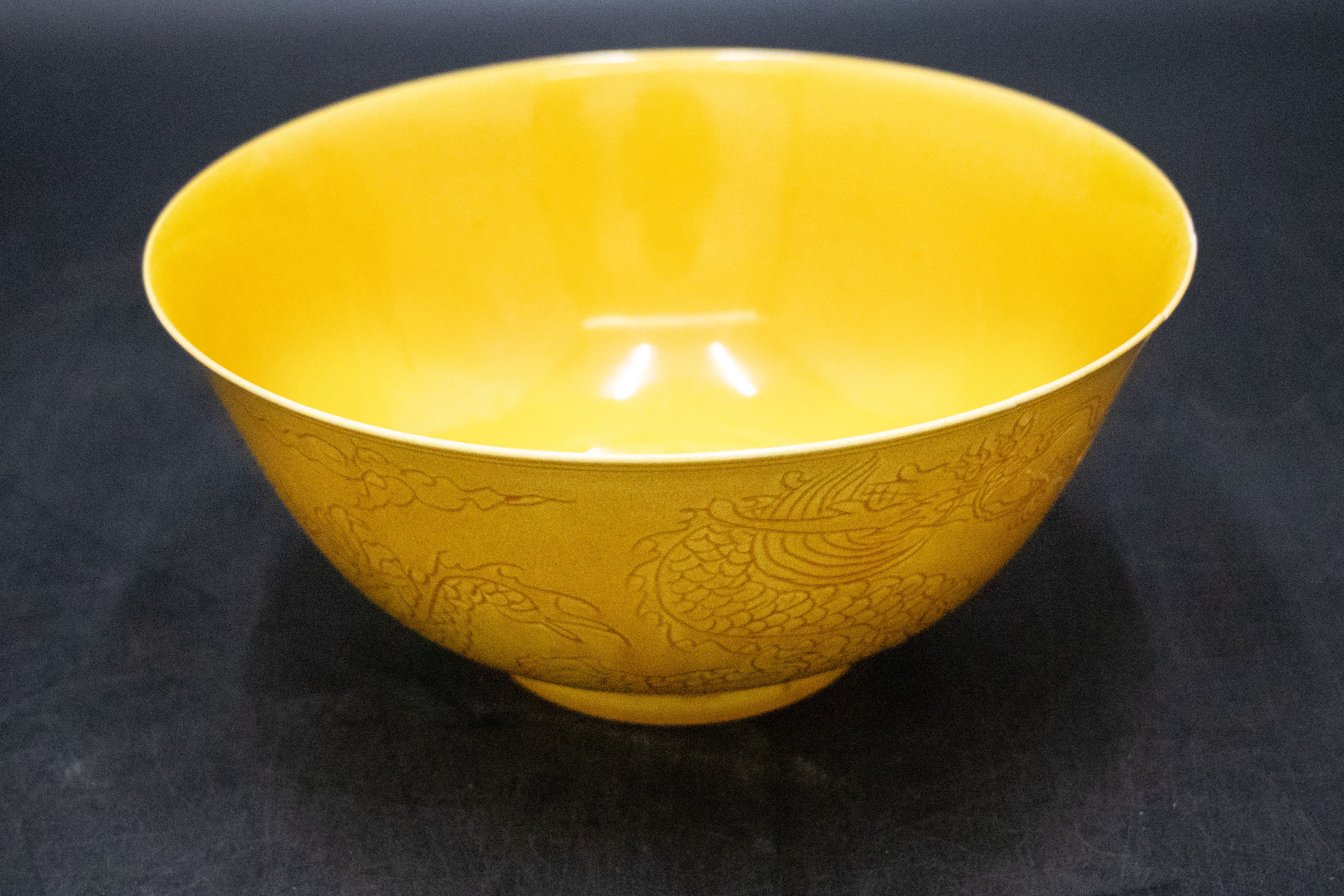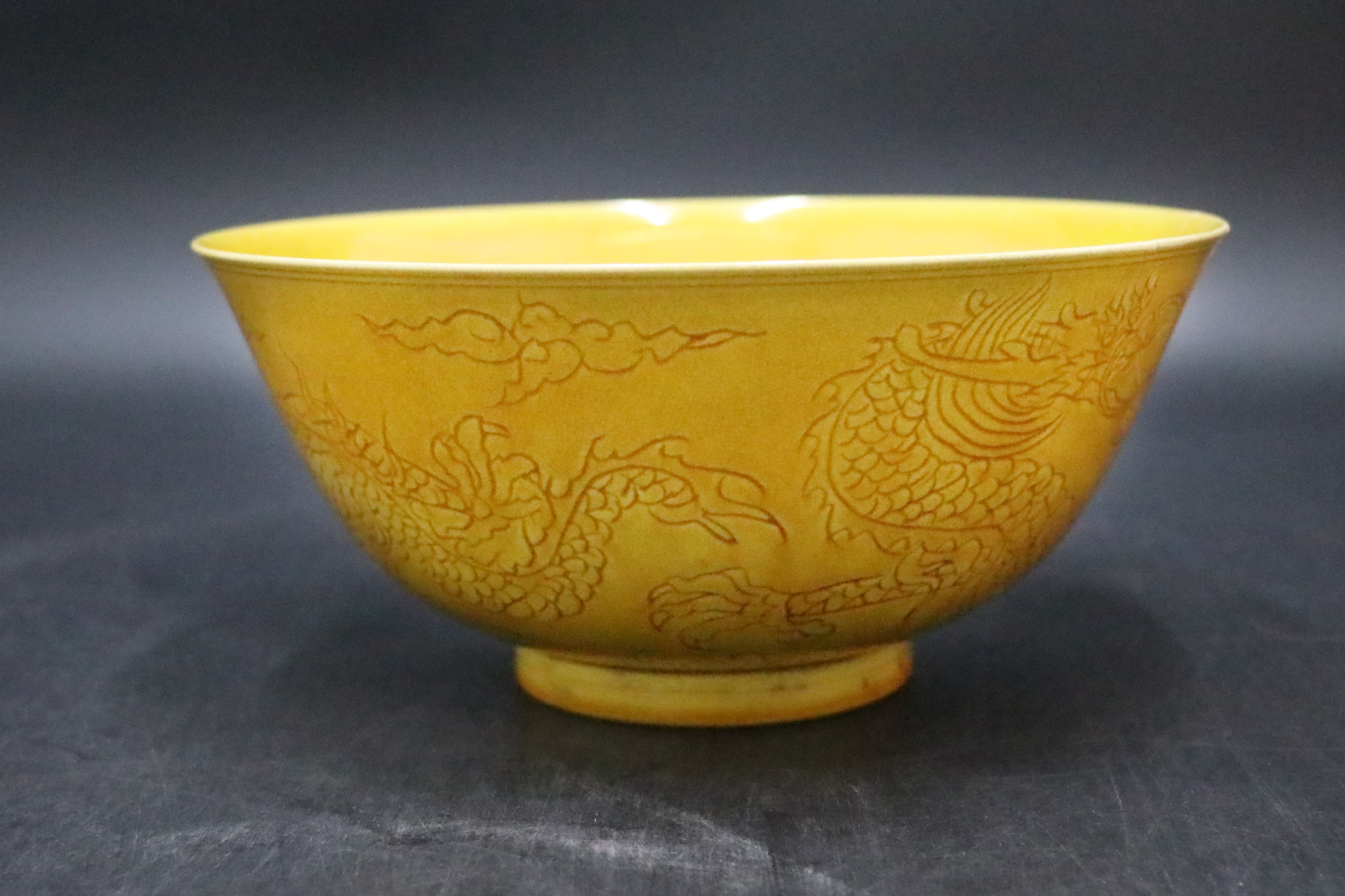 黃釉在明代為皇家專屬色,民間禁用。此碗的全黃釉+龍紋組合,代表了皇權(quán)的獨(dú)尊威嚴(yán)。成化朝是明代瓷器發(fā)展的鼎盛時(shí)期之一,其御窯瓷器以“精巧雅致、獨(dú)具一格”聞名于世,其暗刻工藝需在釉下刻畫紋飾后施釉燒制,體現(xiàn)了明代官窯的高超制瓷水平。