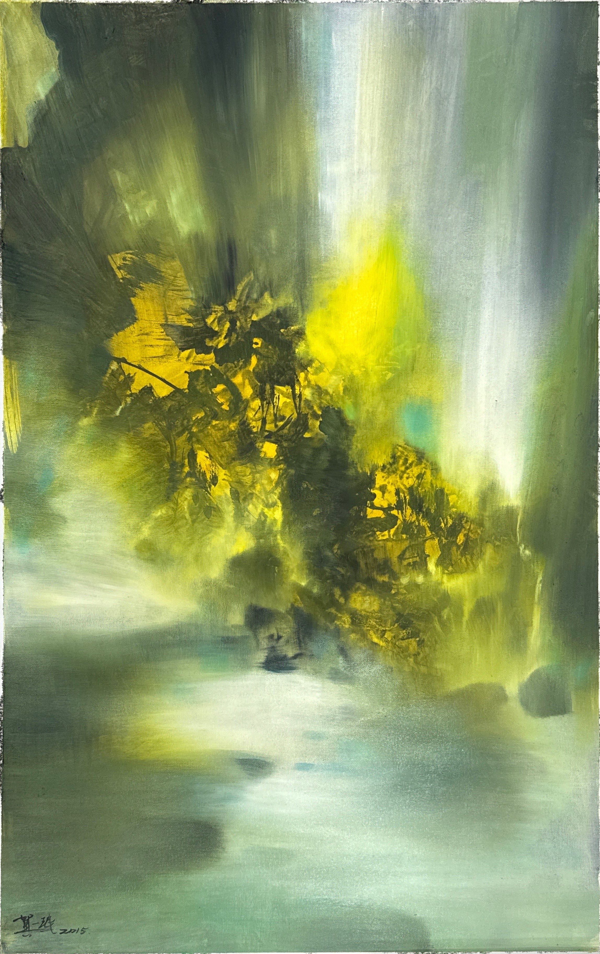 當油彩的厚重與水墨的空靈在畫布上相遇,便有了賀一珉2015年這幅《山水之韻》。作為趙無極晚年親授的弟子,他以西方油畫的肌理為骨,以東方山水的意境為魂,在尺幅間織就出一片氤氳玄妙的精神天地。