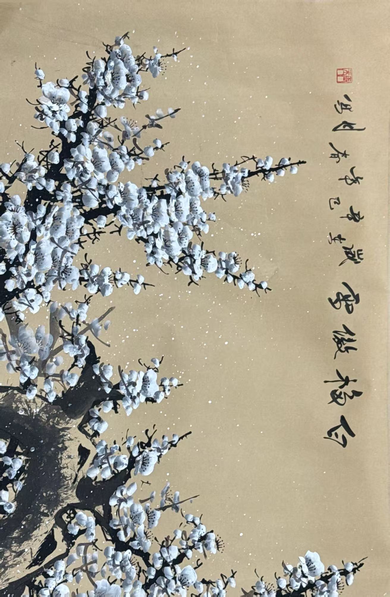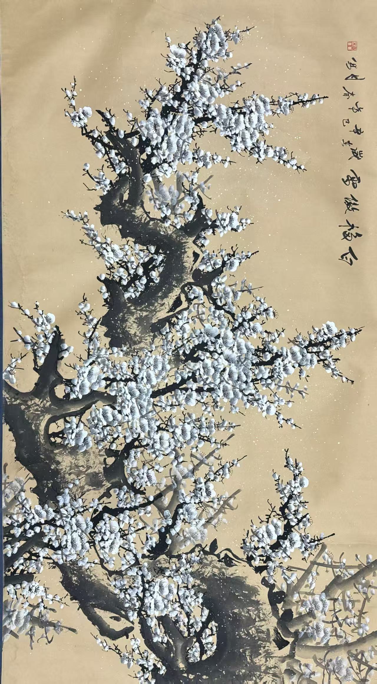 當這幅《白梅傲雪圖》懸于壁間,一室便有了千年的清氣。它是案頭的精神醒劑:每當世俗的喧囂涌來,抬眼便見老干撐著素花,在時光里站成永恒的姿態(tài)——那是告訴我們:生命的尊嚴,從不在諂媚與迎合里,而在如梅般,于霜雪間綻放獨有的芬芳。這不是一幅畫,是一位古人遞來的精神請柬,邀你共赴一場關(guān)于傲骨與清芬的千年之約。