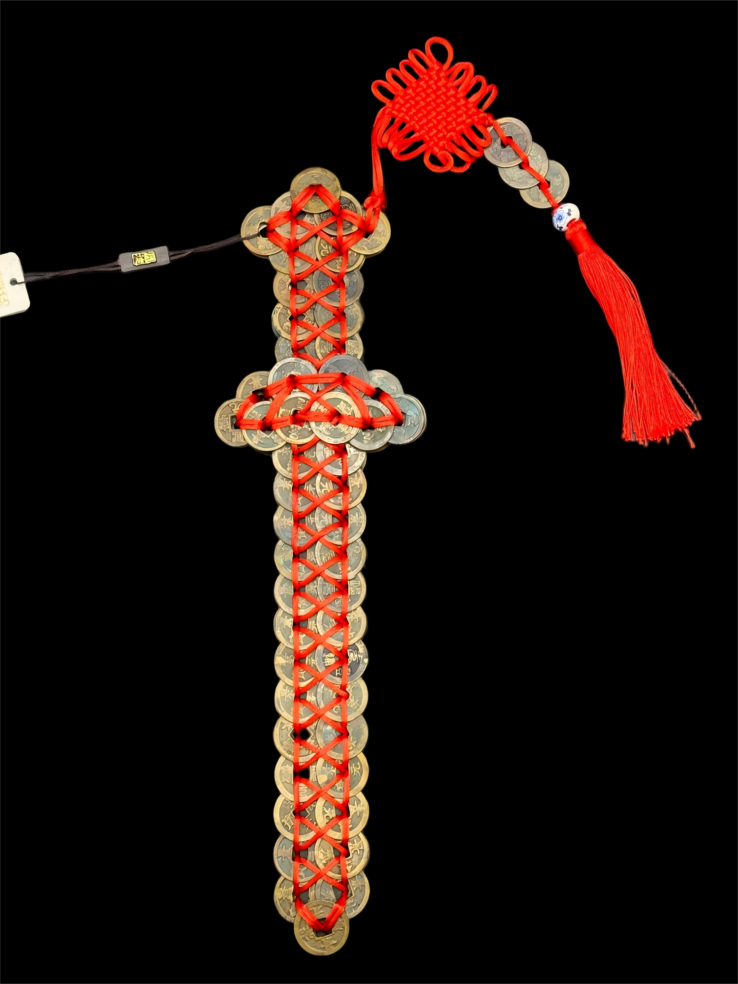 從文化寓意看,“尚方寶劍”本是古代皇權(quán)象征,此處以古錢編結(jié)的形式呈現(xiàn),賦予了新的民俗寓意:古錢象征“財富、吉祥”,尚方寶劍的形制象征“鎮(zhèn)宅、辟邪”,二者結(jié)合既延續(xù)了尚方寶劍“權(quán)威、護(hù)佑”的意象,又融入了古錢“招財納?!钡拿袼自V求,是民俗文化中“符號重構(gòu)”的體現(xiàn)——這類器物常被作為家居擺件,承載著“鎮(zhèn)宅、招財、保平安”的民間愿望。